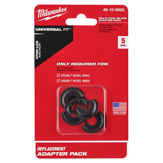 Our OPEN-LOK™ Blade Adapter 5 Pack is for Dremel Multi-Tool Models MM45 and MM50. The MILWAUKEE® Multi-Tool Blade Adapter is only needed for use with the Dremel Brand multi-tool models MM45 and MM50. It is not required for any additional brands or models. The raised adapter shape design allows you to easily install and remove. Our Blade Adapter is designed and made in the USA.