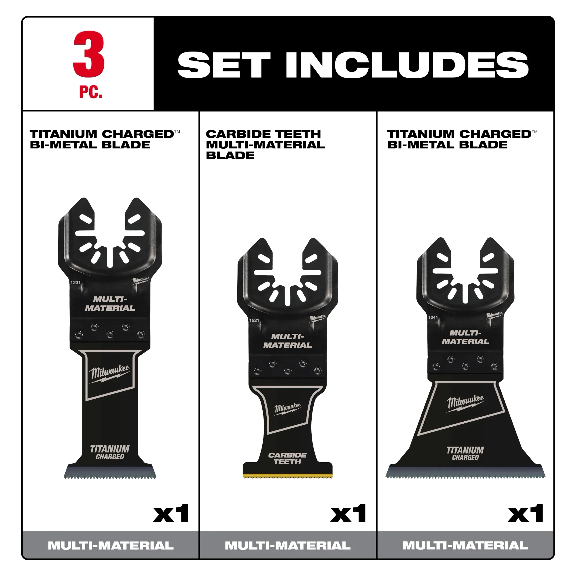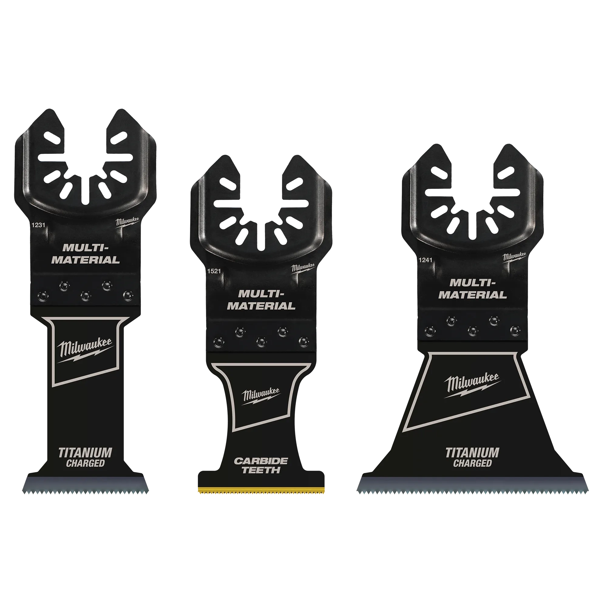 Our OPEN-LOK™ 3 PC Multi-Material Oscillating Multi-Tool Blade Set provides you with an assortment of blades for multi-material applications like screws, nails, wood, cement board, plaster, PVC, drywall, and more. The NITRUS™ Carbide Extreme Materials Universal Fit OPEN-LOK™ Oscillating Multi-Tool Blades provide the ultimate cutting experience, delivering the fastest cutting and longest life on the job site. The extreme materials NITRUS™ Carbide multi-tool blade delivers 2X more cuts than Carbide Teeth blades - capable of hundreds of cuts in screw-embedded wood. TITANIUM CHARGED™ Bi-Metal blades have an optimized titanium blend for maximum wear-resistance and up to 15x longer life vs. high carbon steel (HCS) blades. These blades feature a reinforced Universal Fit OPEN-LOK™ anchor for better strength & control and allow for quick blade changes across 100+ multi-tools. Not compatible with Starlock tools. MILWAUKEE® oscillating multi-tool blades are designed and made in the USA with global materials.