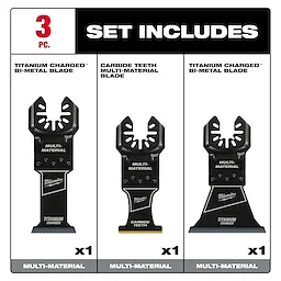 Includes: (1) 1-3/8" NITRUS™ Carbide Extreme Materials Blade (1) 1-3/8" TITANIUM CHARGED™ Bi-Metal Multi-Material Blade, (1) 2-1/2" TITANIUM CHARGED™ Bi-Metal Multi-Material Blade