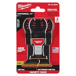 Our Universal Fit OPEN-LOK™ 3-Piece Metal Oscillating Multi-Tool Blade Variety Pack offers you blades ideal for cutting a variety of soft to extreme metals, wood, nails, PVC, drywall, and more. The included Titanium Enhanced Carbide Teeth Blade is designed to last up to 50X longer in extreme metals compared to standard bi-metal blades. The Carbide Teeth are ideal for cutting screws, bolts, metal pipe, nails, and more. The Titanium Enhanced Bi-Metal Blade uses premium high-speed steel and lasts up to 15X longer than standard high carbon steel blades. The bi-metal blades have a slightly wider cutting width than most standard bi-metal blades and a longer blade body for a longer reach and deeper plunge cut. A combination of tooth design and material provides better soft metal cutting performance. These bi-metal blades are ideal for smooth cuts in soft metals, wood, nails, copper pipe, PVC, and drywall. This MILWAUKEE® oscillating tool blade variety pack is designed and made in the USA with global materials.