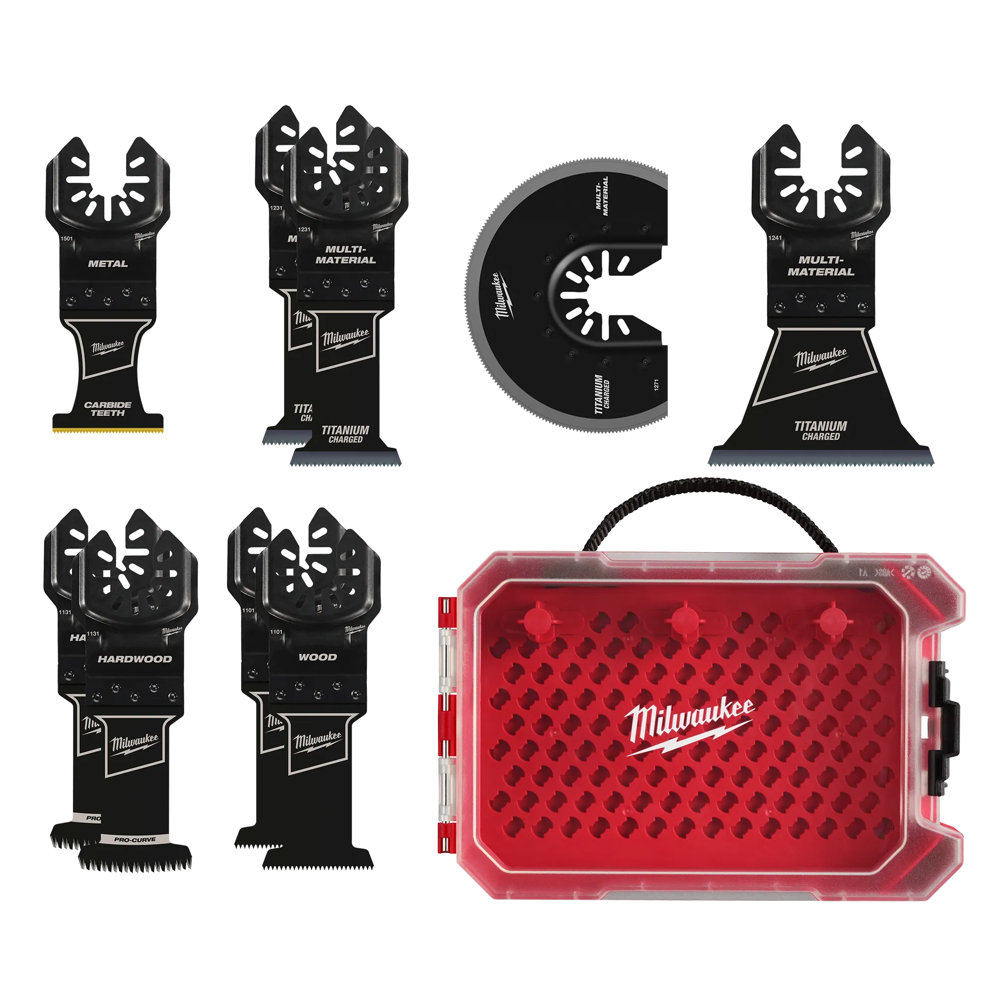 Includes: (1) OPEN-LOK™ 1-3/8" Carbide Teeth Metal Multi-Tool Blade, (2) OPEN-LOK™ 1-3/8" TITANIUM CHARGED™ Bi-Metal Multi-Material Multi-Tool Blade, (1) OPEN-LOK™ 2-1/2" TITANIUM CHARGED™ Bi-Metal Multi-Material Multi-Tool Blade, (1) OPEN-LOK™ 3-1/2" TITANIUM ENHANCED™ Bi-Metal Multi-Material Segmented Multi-Tool Blade, (1) OPEN-LOK™ 1-3/8" HCS Japanese Tooth PRO-CURVE™ Hardwood Multi-Tool Blade, (1) OPEN-LOK™ 1-3/8" HCS Wood Multi-Tool Blade, (1) Storage Case