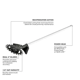 Our M18 FUEL™ QUIK-LOK™ Reciprocator Attachment is powered by the M18 FUEL™ Power Head w/ QUIK-LOK™ and is compatible with our split boom M18 FUEL™ QUIK-LOK™ Attachment System. This Reciprocator Attachment allows users to cut with precision and accuracy, minimizes thrown debris, and prevents marring during close proximity cutting. Our reciprocator utilizes dual 9" blades and has a 1/2" cut capacity providing users with the ability to quickly clear thick brush. Our M18 FUEL™ QUIK-LOK™ Attachments feature protective drive shafts for increased durability against drops and while in storage. This split boom Reciprocator Attachment also utilizes M18 FUEL™ Technology combined with optimized gearing to manage the RPM output specifically for reciprocating applications. The M18 FUEL™ QUIK-LOK™ Attachment System features 13 different attachments for a wide array of applications to stay productive through all seasons.