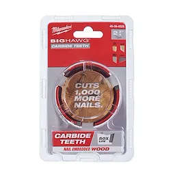Our MILWAUKEE® BIG HAWG™ with Carbide Teeth is the best hole saw solution for nail-embedded wood and abrasive material applications. Our first-to-market hole saw offers extreme life utilizing advanced carbide technology. The BIG HAWG™ gives users 50X more life in demanding applications with the ability to cut 1000+ more nails. The heavy duty hole saw has 10X larger carbide teeth that rip through materials five times faster. Deeper slots allow for fast and easy plug removal. Our BIG HAWG™ hole saw is the best solution for cutting through the toughest materials, including nails, cement board, shingles, plaster and stucco.