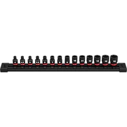 Kit includes 14 Standard Metric Sockets. The following sizes are included: 4, 4.5, 5, 6, 7, 8, 9, 10, 11, 12, 13, 14, 15