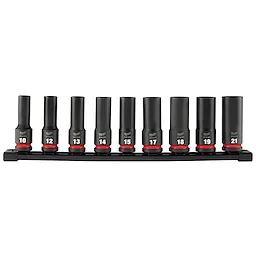 Kit includes 9 Deep Metric Sockets. The following sizes are included: 10, 12, 13, 14, 15, 17, 18, 19, 21