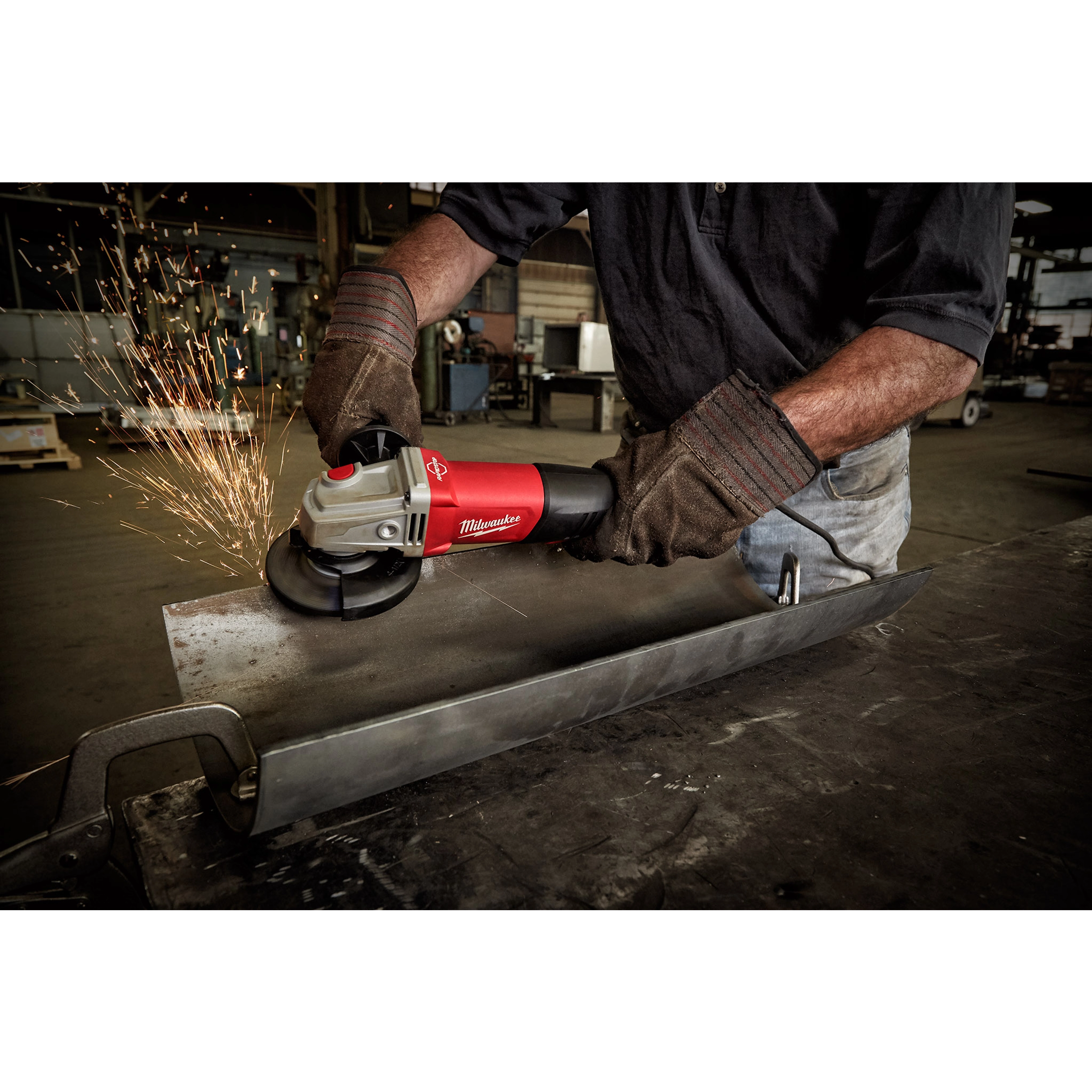Our 11 Amp 4-1/2” / 5” AC Braking Small Angle Grinder (Paddle, No-Lock) delivers you up to 3X more durability and up to 50% more power than the competition. The RAPID STOP™ braking feature is fully integrated into the tool and stops all accessories in 2 seconds or less. The 1,400 MWO motor allows you to power through the toughest jobs and is the perfect match for industrial applications. The small angle grinder's grip circumference measures a full 2” less than the competition giving you more control and less fatigue for all-day use. Our Electronic Advantage includes Overload Protection to maximize your tool's motor life. The Electronic Clutch extends your tool's life and helps prevent bind-ups while the Line Lock-Out feature prevents automatic start-up after power loss and soft starts. The small bench grinder is lanyard-ready with an incorporated lanyard loop on the handle. The grinder features a 100% tool-free design, allowing you to change all accessories, including hubbed product, without a wrench. Additionally, the tool-free, burst-resistant adjustable guard allows you to make quick guard installations and adjustments with minimal downtime.