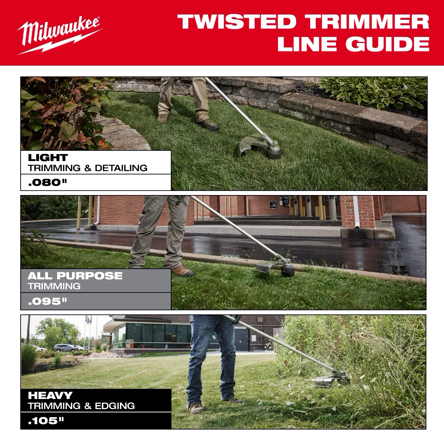 Milwaukee® Twisted Trimmer Line provides More Trigger Time to maximize productivity. We offer a range of trimmer line targeted at a variety of trimming applications. Our .080” line is ideal for light trimming & detailing applications, while our .095” line is the best solution for all-purpose trimming. We also have .105” trimmer line, our largest diameter, targeted at heavy trimming and edging applications.