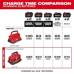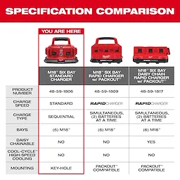 The M18™ Six Pack Sequential Charger offers a compact design, integrated hang holes for vertical mounting, and a pass through plug to conserve outlet space. The new unit will charge M18™ compact batteries in 30 minutes and extended capacity (XC) batteries in 60 minutes. With this new six pack charger, users can reduce the amount of time spent changing out batteries, increasing productivity on the jobsite.