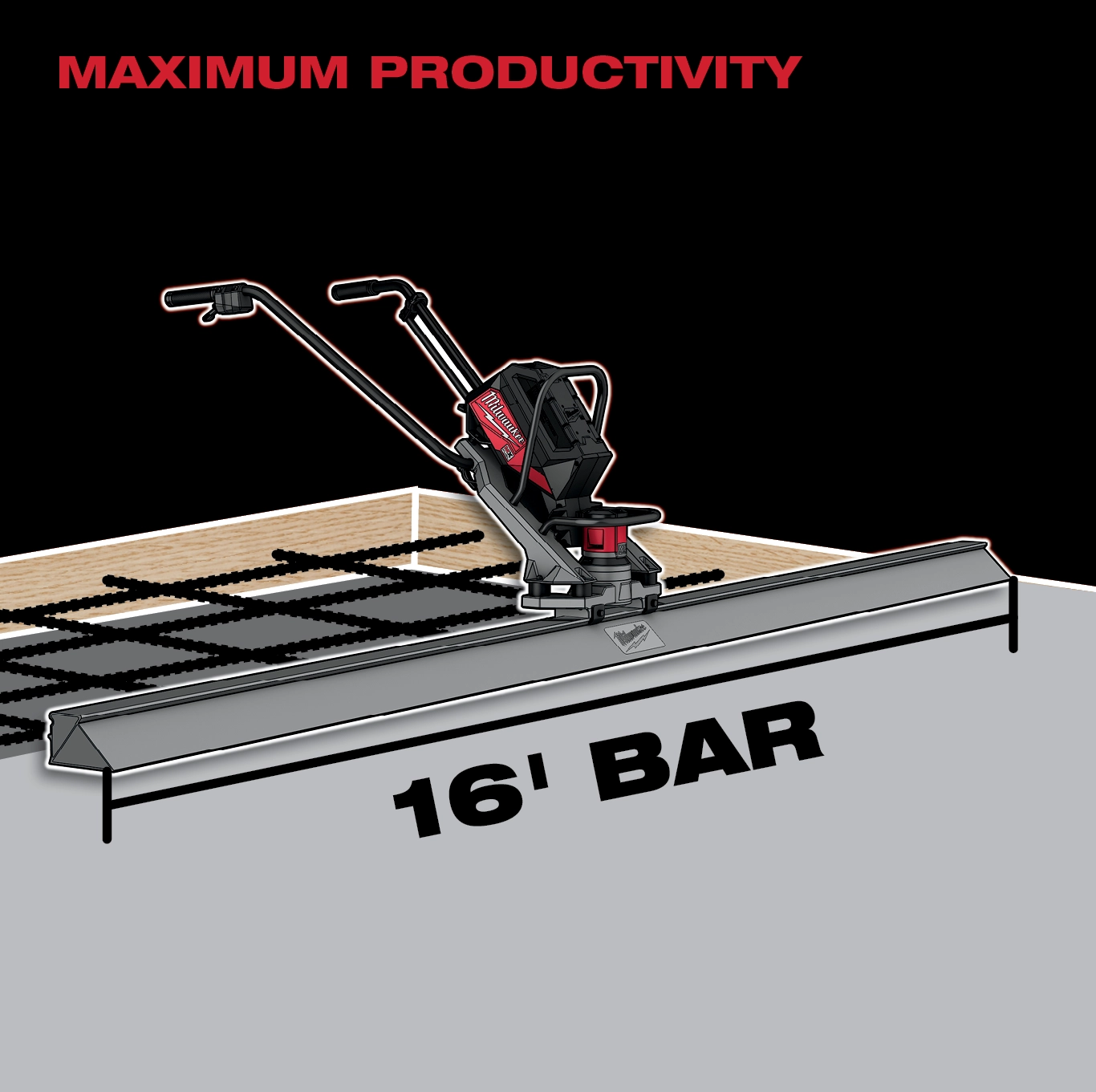 Our MX FUEL™ Vibratory Screed provides consistent starts and the most reliable pours with the power to pull up to 16 ft bars, no gas headaches, and 2 hours of runtime per charge with a 12 ft bar. The POWERSTATE™ Brushless Motor delivers the power to pull 16 ft bar at 9,000 VPM with a variable speed trigger, giving you maximum control in stiff and wet concrete. The MX FUEL™ REDLITHIUM™ battery pack provides instant power with no gas headaches and requires no regular maintenance, produces less noise, and has zero emissions for a safer workspace, indoors or outdoors. The push-button start delivers instant power, eliminating the repetitive motions of a pull start and reducing downtime, allowing you to get jobs done faster without sacrificing the power and runtime you expect. The battery-powered vibratory screed is compatible with all MX FUEL™ REDLITHIUM™ batteries, giving you the hardest working and most reliable power for equipment. The MX FUEL™ Vibratory Screed can accept bars up to 16 ft long without sacrificing power and can run two motors on one bar for increased mobility. REDLINK PLUS™ Intelligence ensures optimal performance and provides overload protection to protect your machine and battery during the toughest applications. The MILWAUKEE® MX FUEL™ Vibratory Screed is ONE-KEY™ Compatible. You can track, manage and secure your equipment from your mobile device or computer using the industry’s largest Bluetooth® community tracking network. If your screed is ever lost or stolen, you can prevent tampering with remote lockout capability.