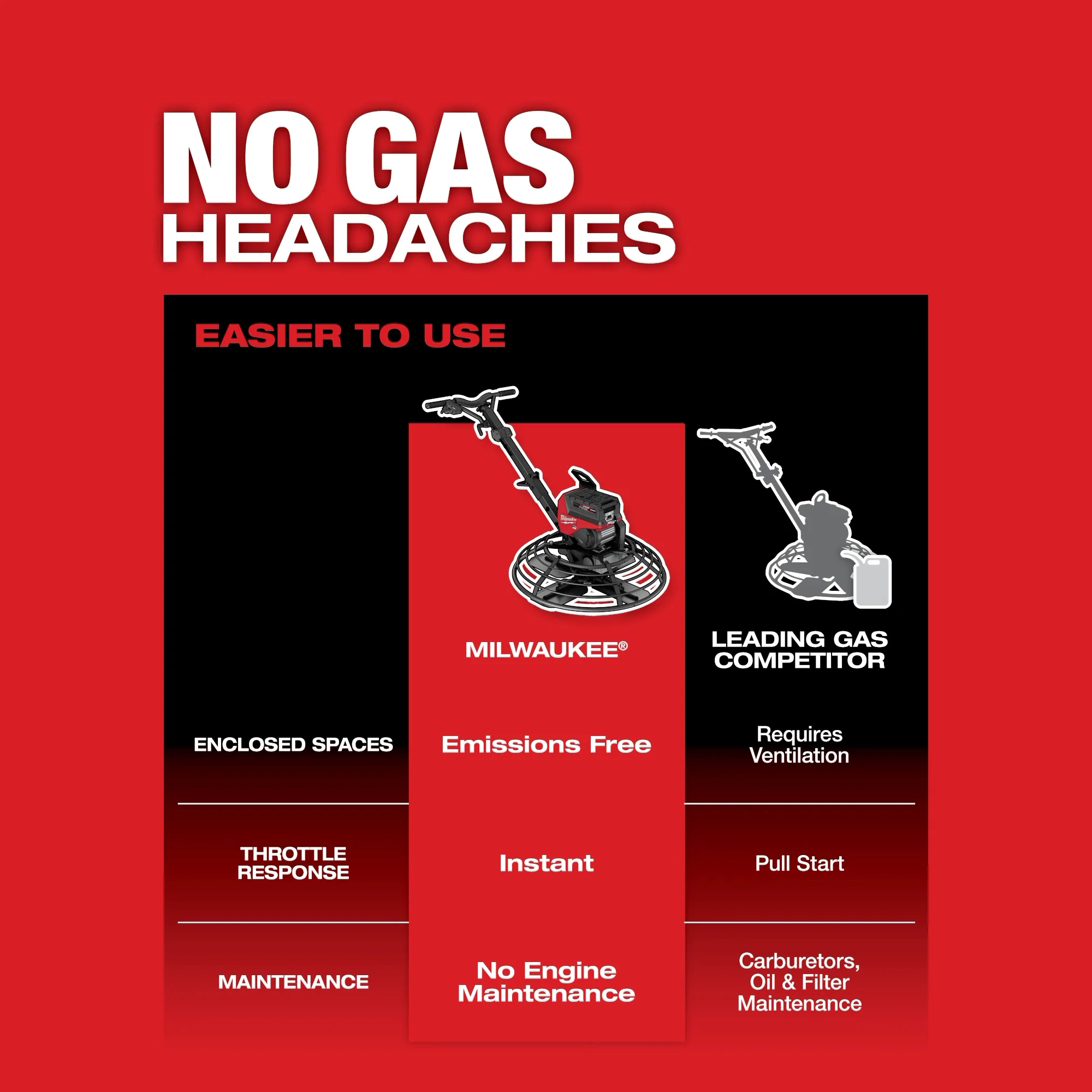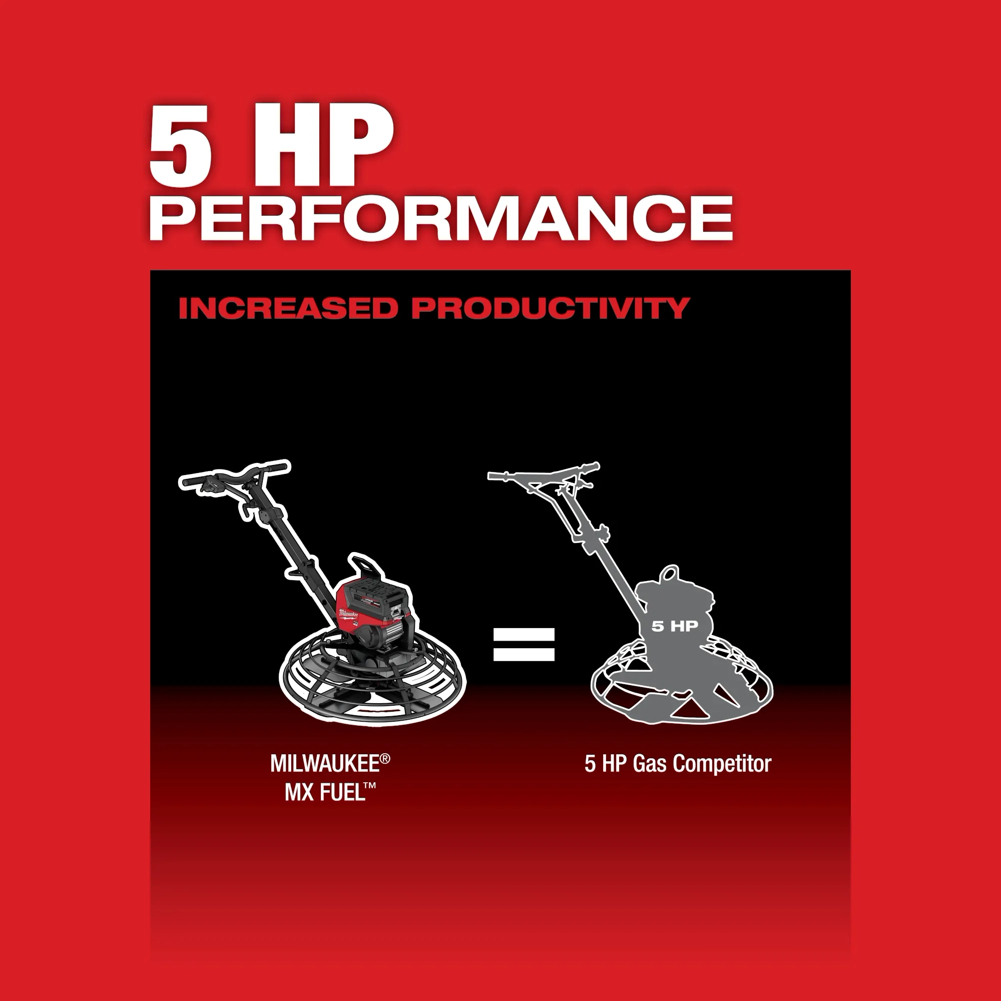 Includes: (1) MX FUEL™ 36” Walk- Behind Trowel, (3) MX FUEL™ REDLITHIUM™ FORGE™ HD12.0 Battery Packs, and (1) MX FUEL™ Supercharger