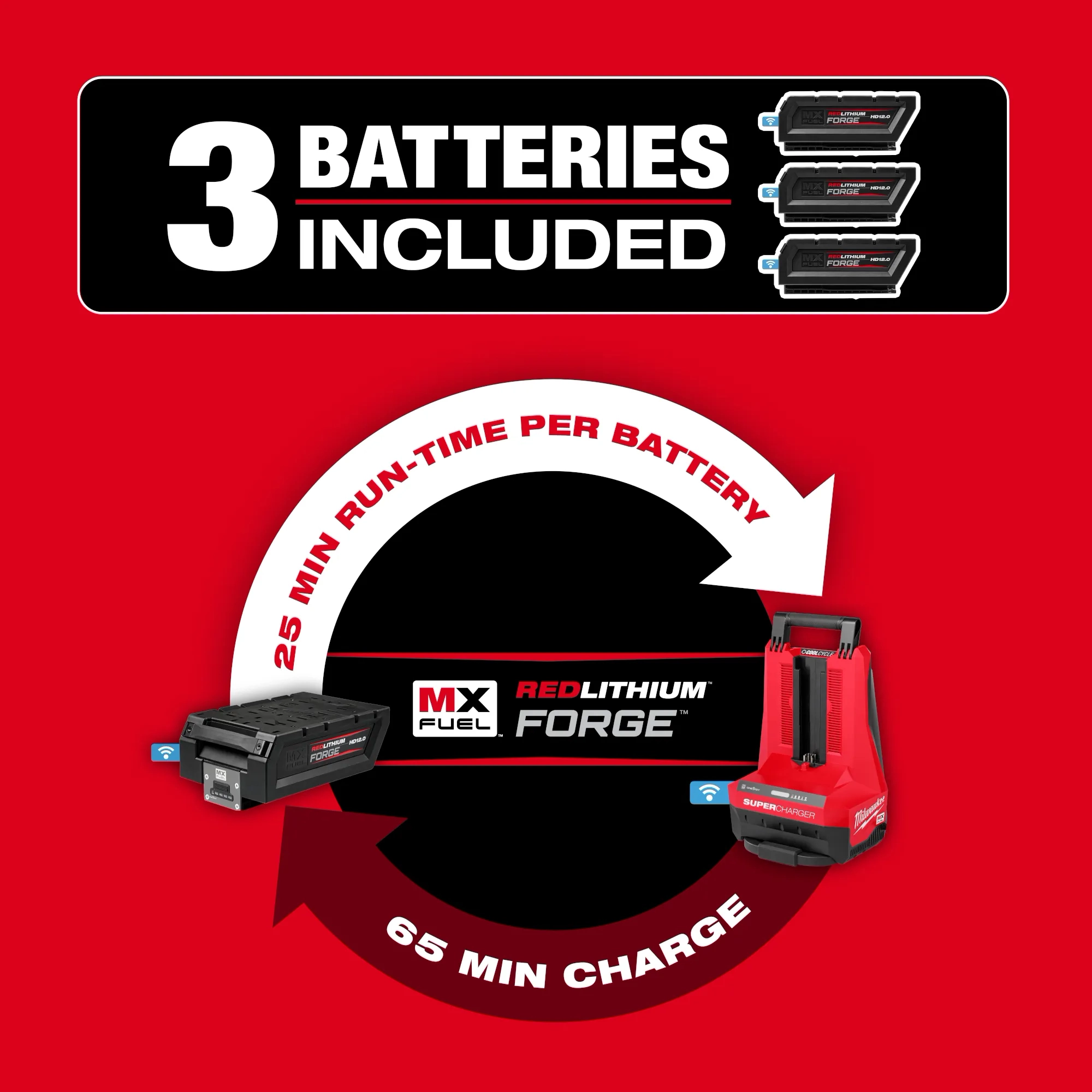 Both the MX FUEL™ REDLITHIUM™ FORGE™ HD12.0 Battery & MX FUEL™ Super Charger are COOL-CYCLE™ Capable, delivering high-speed cooling for less downtime
