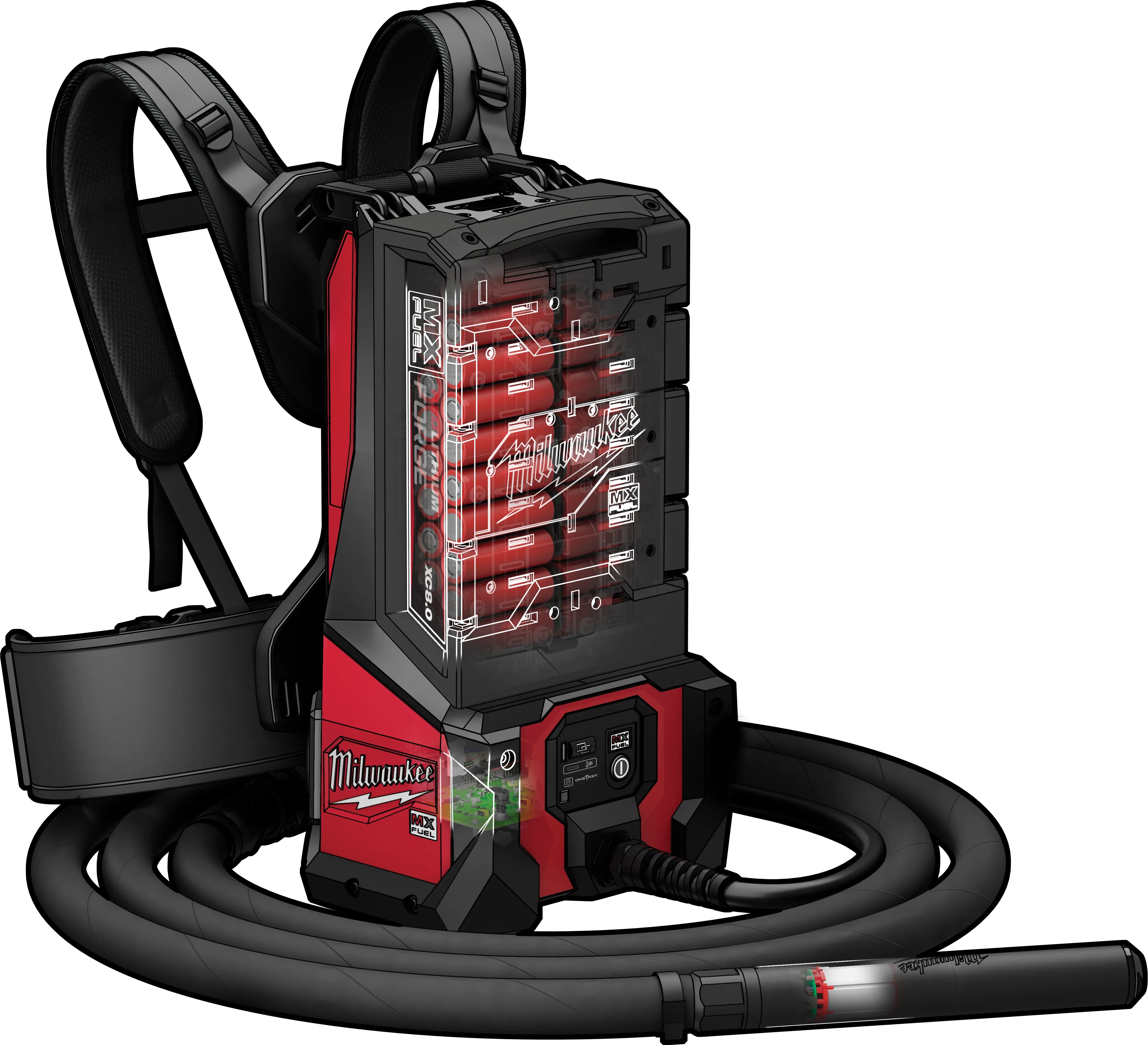 Includes: (1) MX FUEL™ High Cycle Concrete Vibrator, (1) Backplate and Backpack Straps, (1) MX FUEL™ High Cycle Concrete Vibrator 7’ Whip / 1.75” Head, (2) MX FUEL™ REDLITHIUM™ 8.0 Batteries, (1) MX FUEL™ Supercharger and Remote
