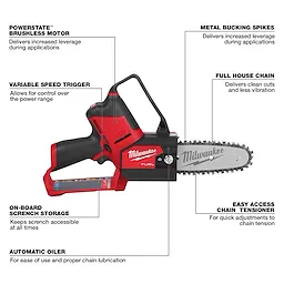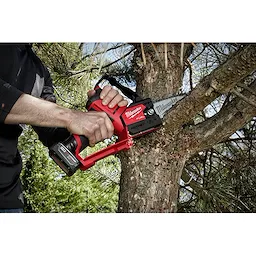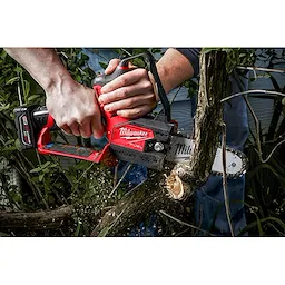 Our M12 FUEL™ HATCHET™ 6" Pruning Saw delivers unmatched control & access, has the power to cut 3" hardwoods, and delivers up to 120 cuts per charge. This electric pruning saw is designed to meet the ergonomic, performance, and durability needs of landscape maintenance professionals. Weighing less than 5 lbs and featuring a compact design, the cordless pruning saw gives you increased control and maneuverability in tight access areas. The POWERSTATE™ Brushless Motor delivers the power to complete cuts in demanding hardwood materials. The REDLINK PLUS™ Intelligence enables full-circle communication between the tool and battery, providing you with unmatched levels of performance, protection, and productivity. The advanced electronic package also delivers an instant throttle response and a variable speed trigger for ultimate control over the power range. The M12™ REDLITHIUM™ XC 4.0Ah Battery (sold separately) delivers best in class run-time and performance. This pruning saw features a full house chain, easy access chain tensioner, automatic oiler, metal bucking spikes, and onboard storage for the scrench. The MILWAUKEE® M12 FUEL™ HATCHET™ 6" Pruning Saw is part of the M12™ System which is fully compatible with over 100 solutions. In addition to the Pruning Saw (2527-20), this product includes (1) Oregon 6" Bar & Chain, (1) Scabbard, and (1) Scrench.