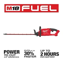 The M18 FUEL™ 24" Hedge Trimmer has the power to cut ¾” branches, cuts up to 30% faster, and provides up to 2 hours of run-time per charge. Designed to meet landscape maintenance professional needs, the handle placement and weight distribution provide the best combination of balance and control. The trimmer features a slider-crank mechanism and all-metal gear case providing unmatched durability and longer life. The 24” blade trims more material in a single pass, increasing reach and productivity. The blade tip guard prevents damage to the property and the blades. The M18 FUEL™ 24" Hedge Trimmer is fully compatible with 200+ solutions on the M18™ system.