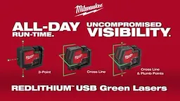 Our USB Rechargeable Green Cross Line and Plumb Points Laser is powered by REDLITHIUM™ USB, delivering all day runtime and uncompromised visibility. The high-intensity laser beams allow you to see the green beams, lines, and plumb points up to 100' for fast and accurate leveling and alignment. The integrated magnetic bracket features a micro-adjust control that pivots on point, giving you a faster set-up and point to point alignment at long distances. This cross line laser with plumb points features amplified rare earth magnets provide a strong hold onto metal surfaces with integrated screw and nail hang holes that make setup easy and efficient in any environment. You can charge the REDLITHIUM™ USB Battery inside the laser via Micro USB or swap it out with additional REDLITHIUM™ USB Batteries for virtually no downtime. The MILWAUKEE® USB Rechargeable Green Cross Line and Plumb Points Laser is great for any trade professional and is covered by a two-year warranty.