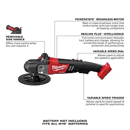 Our M18 FUEL™ 7" Variable Speed Polisher is the world’s first cordless full-size rotary polisher. By harnessing the power, performance and run-time of M18 FUEL™ technology, this tool delivers corded performance that allows you to power through the most demanding applications. At more than 1 lb. lighter than corded, and the ability to deliver total control through a variable speed dial and trigger, the new M18 FUEL™ Polisher frees you from extra work, distractions, paint damage, and inconvenience caused by cords. Paired with M18 XC5.0 batteries, the M18 FUEL™ Polisher can complete a full size car on one charge when working on moderate to good paint. The M18 FUEL™ Polisher is equipped with a rubber over mold front housing to protect the paint from scratches in use as well as a removable dust cover to protect the motor and electronics from wool fibers and residue. The new tool is designed to distribute more of its weight over the pad, providing natural pressure on the surface area and more.