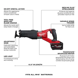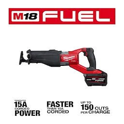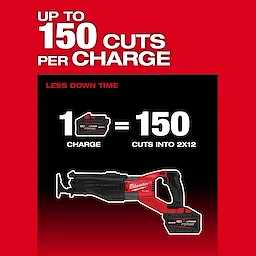 The SUPER SAWZALL® Reciprocating Saw generates 15A corded power, faster cuts than 15A reciprocating saws and delivers Up To 150 Cuts in 2x12 SPF per charge. Designed to perform in the toughest applications, the M18™ FUEL SUPER SAWZALL® combines Milwaukee's legendary performance and durability with the portability of the M18™ platform. The POWERSTATE™ Brushless Motor Provides 3,000 SPM and higher speeds under load for corded cutting performance. REDLINK PLUS™ intelligence ensures maximum performance and protection from overload, overheating and over discharge. The M18™ REDLITHIUM™ HIGH OUTPUT™ HD12.0 battery delivers unmatched run-time in all applications. The 1-1/4" stroke length removes more material with each stroke and On/Off orbital action provides aggressive cuts in wood and smooth cuts in metal. Variable speed trigger and 5-speed dial provide maximum speed control for any application. The QUIK-LOK® blade clamp allows for tool less blade changes and a rafter hook provides a convenient way to store the saw between cuts.