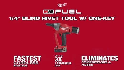 Our M18 FUEL™ ¼” Blind Rivet Tool w/ ONE-KEY™ is the fastest cordless rivet tool. It eliminates the need for hoses and compressors while delivering up to 3X longer life than other cordless riveters. This rivet gun significantly increases productivity, installing rivets up to 50% faster than cordless competitors. The premium steel alloy 3-jaw design delivers more work between jaw changes. While lightweight, this Milwaukee rivet gun was designed to withstand harsh shop or assembly plant environments, manufactured with an all-metal gearcase, impact strength plastics, and protective over-mold. The POWERSTATE™ Brushless Motor delivers 4,500 lbs. (20kN) of pulling force for high strength blind rivets in all materials. This rivet tool pulls up to 900 3/16” aluminum or 500 1/4” aluminum blind rivets on one charge with an M18™ REDLITHIUM™ CP2.0 battery. M18™ REDLITHIUM™ Battery Packs fit M18™ tools, providing you with more work per charge and more work over the battery life. REDLINK PLUS™ Intelligence ensures maximum performance and protects the rivet tool and battery against overloads, over-heating, and over-discharge. The MILWAUKEE® M18 FUEL™ ¼” Blind Rivet Tool with ONE-KEY™ compatibility, allowing you to track and manage your tool.