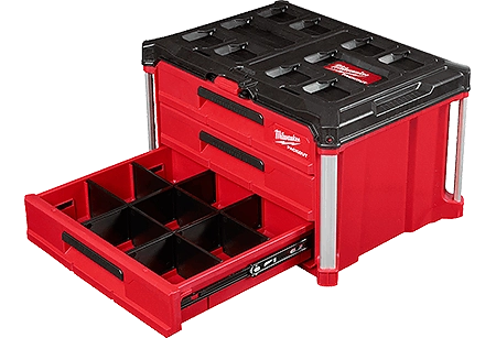 Our PACKOUT™ 3-Drawer Tool Box has a 50lbs weight capacity and a locking security bar that allows you to padlock the drawers closed keeping them securely shut during transport. As part of the PACKOUT™ Modular Storage, the toolbox allows you to customize your storage system for easy transportation and organization of tools and accessories. This portable toolbox with drawers is constructed with impact-resistant polymers, all-metal ball-bearing slides, and metal-reinforced corners for ultimate jobsite durability. The 3-Drawer Tool Box also allows you to customize your drawer layout with Quick-Adjust Dividers (Includes 1 set of dividers). The MILWAUKEE® PACKOUT™ Modular Storage System is the industry's most versatile and durable storage system.