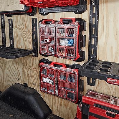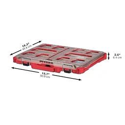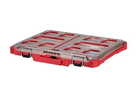 Our PACKOUT™ modular storage system is the industry's most durable and versatile storage system. The PACKOUT™ low-profile organizer is constructed with impact resistant materials so it can withstand harsh jobsite environments. An IP65 rated weather seal protects your tools, accessories, and small parts from rain and other jobsite debris. The shallow organizer's interior features 10 removable storage bins with removable dividers. The transparent lid of the organizer seals the bins to prevent contents from migrating and shifting during transport. Heavy duty latches and reinforced hinges ensure that the slim organizer keeps the contents contained and protected. Our PACKOUT™ modular storage allows you to customize and build your own storage system to easily transport and organize your tools and accessories.