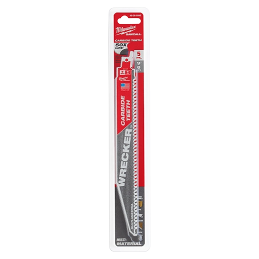 Nuestras hojas SAWZALL® WRECKER™ con dientes de carburo son las hojas de carburo más versátiles del mercado. Estas hojas SAWZALL® para múltiples materiales ofrecen una vida útil hasta 50 veces mayor en comparación con las hojas bimetálicas para sierras alternativas disponibles en la actualidad. Las hojas SAWZALL® WRECKER™ de carburo de MILWAUKEE® ofrecen un diseño de 6 TPI, lo que permite cortar en una amplia variedad de materiales, desde madera limpia hasta hierro fundido, para realizar trabajos de demolición y remodelación rápidamente. El diseño Fang Tip™ le permite realizar cortes de penetración más rápidos en maderas. Los productos con dientes de carburo de Milwaukee le permiten cortar por más tiempo, más cantidad y más rápido que otras hojas con dientes de carburo del mercado.