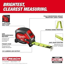 Incluye: (1) 48-22-0428 – cinta métrica de 25 pies con luz LED de 100 lúmenes (1) cable USB