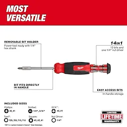 Incluye: P1, P2, SL 1/4", SL 3/16", SQ1, SQ2, SQ3, ECX1, ECX2, T10, T15, T20, T25 y aprietatuercas de 1/4"