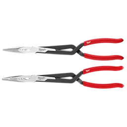 Nuestro juego de pinzas de largo alcance de 13” proporciona el mejor acceso y la máxima fuerza de agarre*. El juego de pinzas de largo alcance de MILWAUKEE® incluye (1) pinza de punta recta y (1) pinza de punta en 45°. Ambas pinzas cuentan con un diseño de mango en cruz de alcance profundo que entrega una abertura ancha de mordaza, mientras que mantiene un perfil delgado para un mayor alcance en espacios estrechos. Las pinzas de una unión proporcionan la máxima fuera de agarre y ofrecen más control cuando se manipulan distintos materiales y objetos. Las mordazas están diseñadas con zonas de agarre multifuncionales para aplicaciones comunes, como sujetadores, arandelas, cables y más. Nuestras pinzas de largo alcance cuentan con un recubrimiento de óxido negro resistente a la corrosión para mayor durabilidad y empuñaduras antideslizantes para un mejor margen de maniobra. Estas pinzas cuentan con una garantía limitada de por vida.