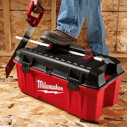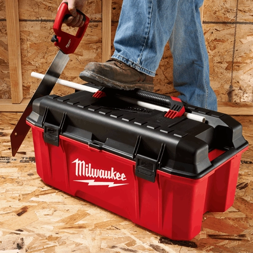 La caja de trabajo de 26” para obra de Milwaukee® es Nothing But Heavy Duty®. Construida con materiales resistentes a impactos, bisagras reforzadas, pestillos empotrados protegidos, y esquinas reforzadas, la caja trabajo de 26” para obra de Milwaukee® está construida para sobrevivir más de 1000 caídas con una carga de 50 libras. Un sello impermeable integrado garantiza que los contenidos de la caja se mantengan secos y libres de contaminación y escombros del lugar de trabajo. Las cómodas agarraderas laterales totalmente abiertas permiten levantar y manipular con facilidad la caja de trabajo, incluso en ángulos extraños. El mango de agarre ancho sobremoldeado hace que transportar cargas no equilibradas sea una tarea mucho más fácil y también se pliega en una ranura cortada para sujeción para realizar un corte seguro de los materiales del lugar de trabajo. El interior de la caja de trabajo de 26” ofrece un amplio espacio para colocar herramientas largas y voluminosas, al mismo tiempo que incorpora un almacenamiento en bolsillos en las esquinas para darles a los usuarios más organización y un fácil acceso a las herramientas de uso común. Los tornillos de refuerzo integrados, incorporados en la tapa, les brindan a los usuarios la oportunidad de montar elementos, tales como cargadores, con un tornillo común. Con el respaldo de una garantía limitada de por vida, la caja de trabajo de 26” para obra de Milwaukee® (48-22-8020) es en realidad más que una caja de herramientas.