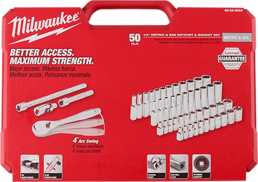 Nuestro juego de trinquete con boca de 1/4" y cubos SAE de MILWAUKEE® de 50 unidades está diseñado desde cero y ofrece a nuestros usuarios los cubos más versátiles que son antirrodadura y están listos para ser usados en llaves. Sus costados FOUR FLAT™ cuentan con un diseño antirrodadura y listo para ser usado en llaves. La herramienta de trinquete de 90 dientes ofrece una oscilación de arco en 4° y un diseño de perfil delgado, lo que le permite trabajar en espacios más estrechos y confinados, ya sea debajo del capó de un automóvil o en medio de una remodelación. El kit de trinquete y cubos viene con una bandeja interna extraíble que tiene el diseño perfecto para almacenarse durante mucho tiempo en una caja de almacenamiento de acero. Todos nuestros cubos tienen grabadas las medidas SAE y métricas en el costado plano para una mayor visibilidad y facilidad de lectura. También viene con un estuche de transporte duradero para una máxima portabilidad. El juego viene con accesorios incluidos, de manera que nuestros usuarios puedan realizar cualquier trabajo, tanto en el garaje como en el lugar de trabajo. Nuestro juego de trinquete y cubos está respaldado por nuestra garantía de por vida.