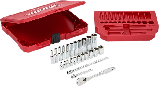 Nuestro juego de trinquete con boca de 1/4" y cubos SAE de MILWAUKEE® de 26 piezas está diseñado desde cero y ofrece a nuestros usuarios los cubos más versátiles que son antirrodadura y están listos para ser usados en llaves. Sus costados FOUR FLAT™ cuentan con un diseño antirrodadura y listo para ser usado en llaves. La herramienta de trinquete de 90 dientes ofrece una oscilación de arco en 4° y un diseño de perfil delgado, lo que le permite trabajar en espacios más estrechos y confinados, ya sea debajo del capó de un automóvil o en medio de una remodelación. El kit de trinquete y cubos viene con una bandeja interna extraíble que tiene el diseño perfecto para almacenarse durante mucho tiempo en una caja de almacenamiento de acero. Todos nuestros cubos tienen grabadas las medidas SAE en el costado plano para una mayor visibilidad y facilidad de lectura. También viene con un estuche de transporte duradero para una máxima portabilidad. El juego viene con accesorios incluidos, de manera que nuestros usuarios puedan realizar cualquier trabajo, tanto en el garaje como en el lugar de trabajo. Nuestro juego de trinquete y cubos está respaldado por nuestra garantía de por vida.