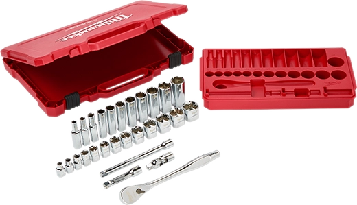 Nuestro juego de llave de trinquete y cubo con boca de 3/8" SAE de MILWAUKEE® de 28 piezas está diseñado desde cero y ofrece a nuestros usuarios los cubos más versátiles que son antirrodadura y están listos para ser usados en llaves. Sus costados FOUR FLAT™ cuentan con un diseño antirrodadura y listo para ser usado en llaves. La herramienta de trinquete de 90 dientes ofrece una oscilación de arco en 4° y un diseño de perfil delgado, lo que le permite trabajar en espacios más estrechos y confinados, ya sea debajo del capó de un automóvil o en medio de una remodelación. El kit de trinquete y cubos viene con una bandeja interna extraíble que tiene el diseño perfecto para almacenarse durante mucho tiempo en una caja de almacenamiento de acero. Todos nuestros cubos tienen grabadas las medidas SAE en el costado plano para una mayor visibilidad y facilidad de lectura. También viene con un estuche de transporte duradero para una máxima portabilidad. El juego viene con accesorios incluidos, de manera que nuestros usuarios puedan realizar cualquier trabajo, tanto en el garaje como en el lugar de trabajo. Nuestro juego de trinquete y cubos está respaldado por nuestra garantía de por vida.
