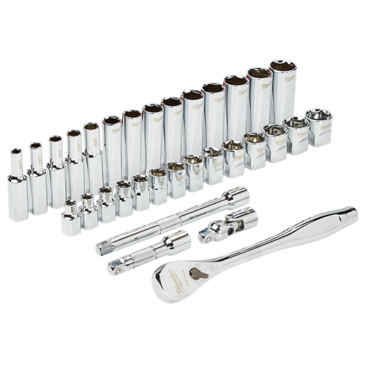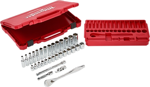 Nuestro juego de llave de trinquete y cubo con boca de 3/8" SAE de MILWAUKEE® de 32 unidades está diseñado desde cero y ofrece a nuestros usuarios los cubos más versátiles que son antirrodadura y están listos para ser usados en llaves. Sus costados FOUR FLAT™ cuentan con un diseño antirrodadura y listo para ser usado en llaves. La herramienta de trinquete de 90 dientes ofrece una oscilación de arco en 4° y un diseño de perfil delgado, lo que le permite trabajar en espacios más estrechos y confinados, ya sea debajo del capó de un automóvil o en medio de una remodelación. El kit de trinquete y cubos viene con una bandeja interna extraíble que tiene el diseño perfecto para almacenarse durante mucho tiempo en una caja de almacenamiento de acero. Todos nuestros cubos tienen grabadas las medidas métricas en el costado plano para una mayor visibilidad y facilidad de lectura. El juego viene con accesorios incluidos, de manera que nuestros usuarios puedan realizar cualquier trabajo, tanto en el garaje como en el lugar de trabajo. Nuestro juego de trinquete y cubos está respaldado por nuestra garantía de por vida.