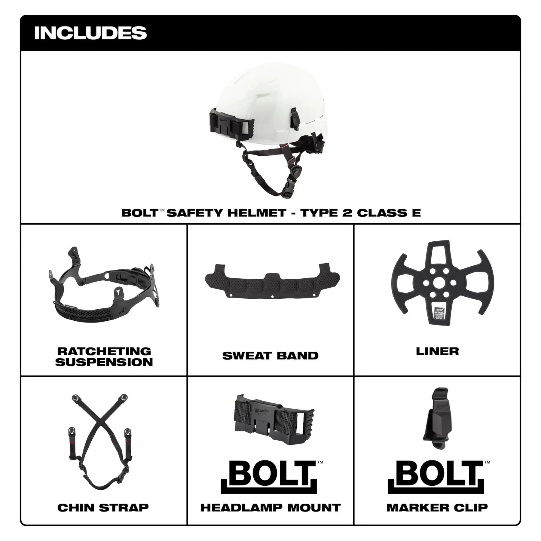 Nuestros cascos de seguridad Tipo 2, Clase E le entregan mejor protección y mayor comodidad. Estos cascos de seguridad ofrecen protección de golpes superiores y laterales. Estos cascos de seguridad para la construcción son compatibles con los accesorios BOLT™, con cuatro ranuras para accesorios BOLT™ y dos ranuras para accesorios universales que integran fácilmente equipos adicionales de protección personal y accesorios, de manera que pueda fijar los accesorios en forma simultánea. Los cascos incluyen un soporte para lámpara BOLT™ de MILWAUKEE® que es compatible con la mayoría de las lámparas para una conexión fácil y segura, y un gancho de marcador BOLT™ para un fácil acceso a bolígrafos y marcadores. Este casco de Milwaukee tiene una suspensión acolchada y cómoda que incluye un trinquete basculante ajustable para mayor comodidad. El casco de estilo escalador también tiene una correa de mentón con cinco hebillas ajustables y cómodas para una mayor comodidad. La banda de sudor y el forro del casco antimicrobianos impiden la formación de olores y bacterias, son extraíbles y pueden lavarse a máquina. Estos cascos de seguridad son ANSI Tipo 2 y puede personalizarlos con su logotipo.