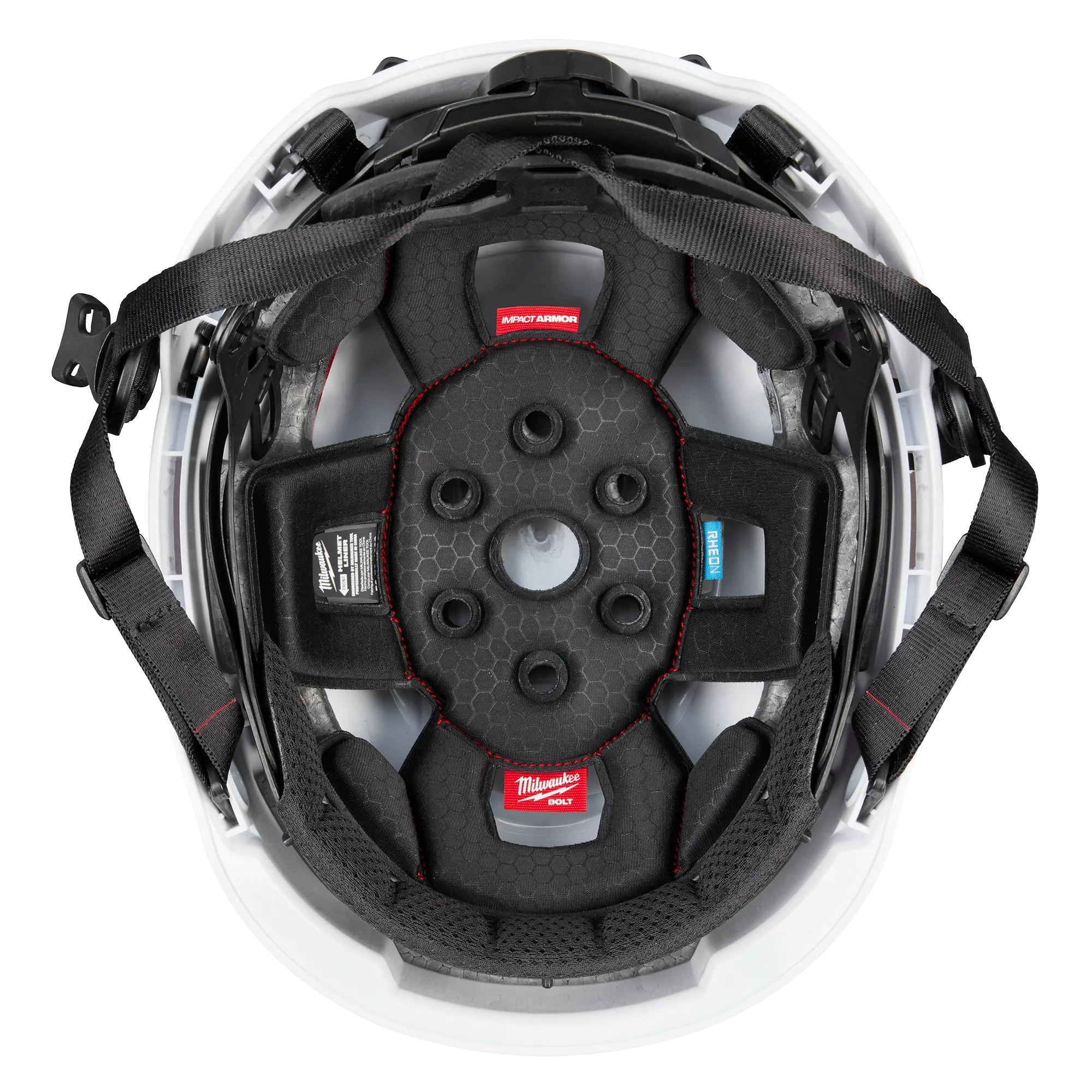 Nuestro casco de seguridad BOLT™ con forro IMPACT ARMOR™ le proporciona protección avanzada contra resbalones, tropiezos y caídas en el lugar de trabajo. Las lesiones por resbalones, tropiezos y caídas son las más comunes y pueden provocar que las fuerzas del impacto oblicuas se traspasen al cerebro. Estos impactos oblicuos pueden provocar lesiones traumáticas en el cerebro. Nuestro forro BOLT™ IMPACT ARMOR™ ofrece la mejor protección contra impactos oblicuos† para ayudar a proteger el cerebro (con el uso de la tecnología RHEON™). Como parte del sistema BOLT™, estos cascos le permiten integrar fácilmente equipos de protección personal y accesorios adicionales, de modo que pueda fijar accesorios simultáneamente. Nuestro casco de seguridad BOLT™ con forro IMPACT ARMOR™ también ofrece protección contra impactos superiores y laterales. Este casco de Milwaukee® tiene una suspensión acolchada y cómoda que incluye un trinquete basculante ajustable para mayor comodidad. El casco de estilo escalador también tiene una correa de mentón con cinco hebillas ajustables y cómodas para una mayor comodidad. Nuestros cascos de seguridad para la construcción incluyen un soporte para lámpara BOLT™ de Milwaukee® que es compatible con la mayoría de las lámparas para una conexión fácil y segura, y un gancho de marcador BOLT™ que permite un fácil acceso a bolígrafos y marcadores. Estos cascos de seguridad son ANSI Tipo 2 y puede personalizarlos con su logotipo. †Basado en impactos en un ángulo de 45° a una velocidad promedio de 6.5 m/s en 16 lugares de prueba en toda la circunferencia del casco.