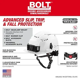 Nuestro casco de seguridad BOLT™ con forro IMPACT ARMOR™ le proporciona protección avanzada contra resbalones, tropiezos y caídas en el lugar de trabajo. Las lesiones por resbalones, tropiezos y caídas son las más comunes y pueden provocar que las fuerzas del impacto oblicuas se traspasen al cerebro. Estos impactos oblicuos pueden provocar lesiones traumáticas en el cerebro. Nuestro forro BOLT™ IMPACT ARMOR™ ofrece la mejor protección contra impactos oblicuos† para ayudar a proteger el cerebro (con el uso de la tecnología RHEON™). Como parte del sistema BOLT™, estos cascos le permiten integrar fácilmente equipos de protección personal y accesorios adicionales, de modo que pueda fijar accesorios simultáneamente. Nuestro casco de seguridad BOLT™ con forro IMPACT ARMOR™ también ofrece protección contra impactos superiores y laterales. Este casco de Milwaukee® tiene una suspensión acolchada y cómoda que incluye un trinquete basculante ajustable para mayor comodidad. El casco de estilo escalador también tiene una correa de mentón con cinco hebillas ajustables y cómodas para una mayor comodidad. Nuestros cascos de seguridad para la construcción incluyen un soporte para lámpara BOLT™ de Milwaukee® que es compatible con la mayoría de las lámparas para una conexión fácil y segura, y un gancho de marcador BOLT™ que permite un fácil acceso a bolígrafos y marcadores. Estos cascos de seguridad son ANSI Tipo 2 y puede personalizarlos con su logotipo. †Basado en impactos en un ángulo de 45° a una velocidad promedio de 6.5 m/s en 16 lugares de prueba en toda la circunferencia del casco.
