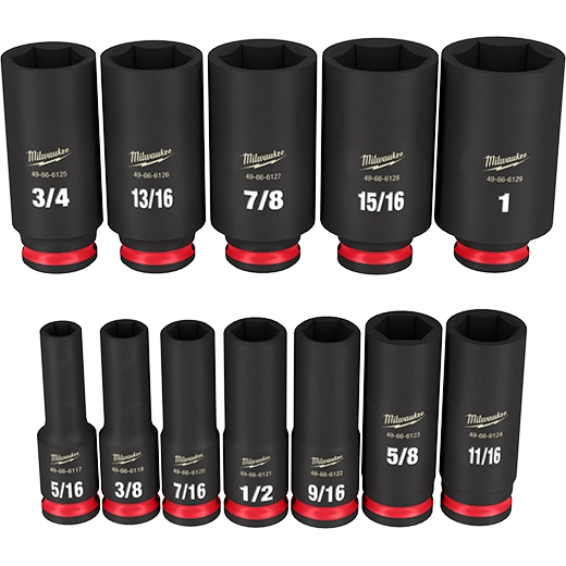 El kit incluye 12 cubos SAE profundos. Se incluyen los siguientes tamaños: 5/16, 3/8, 7/16, 1/2, 9/16, 5/8, 11/16, 3/4, 13/16, 7/8, 15/16, 1