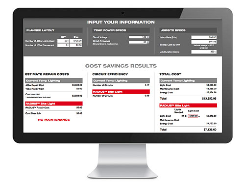Instalación fácil. Luz instantánea. Sin mantenimiento. La luz LED temporal para el lugar de trabajo de 130 vatios RADIUS™ está diseñada para reducir significativamente el tiempo de mano de obra asociado con la instalación temporal de luces, el costo de mantenimiento y el consumo general de energía. Está optimizada para abarcar más espacio de piso que 400 vatios de haluro metálico, mientras que consume un 65 % menos de energía.