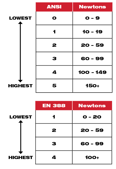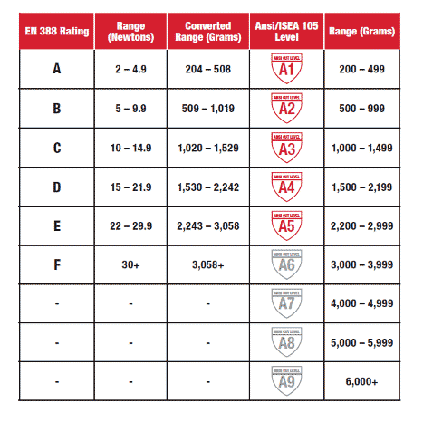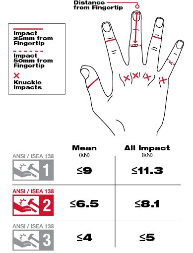 Tanto la norma EN388 como la norma ANSI/ISEA 105 prueban riesgos mecánicos denotados como resistencia a la abrasión, a los cortes, a la rotura y a la perforación. Desde 2019, ANSI/ISEA ahora tiene una prueba adicional para la protección contra impactos para la protección del dorso de la mano. La norma establece los requisitos de rendimiento para los nudillos y los dedos.