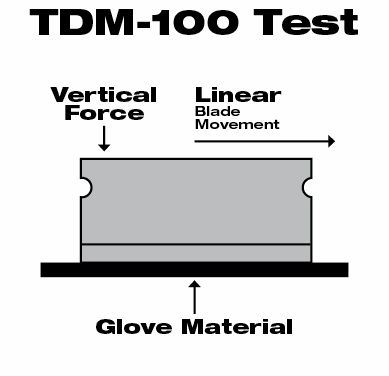 La prueba ANSI/ISEA 105 ahora solo se realiza con una máquina llamada un tomodinamómetro o TDM, y es por esto que la prueba también se denomina prueba TDM-100. Las muestras se cortan 20 mm en línea recta con una hoja de borde recto y distintas cargas de fuerza. El material se corta cinco veces con tres cargas distintas. Con el promedio, la prueba proporciona el puntaje de corte de A1 a A9.