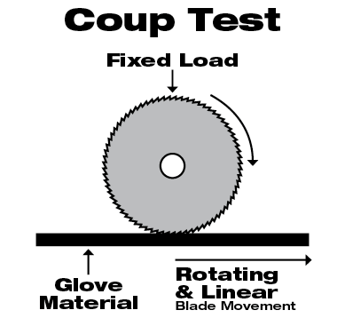 Probado con una hoja giratoria y una carga fija para determinar una clasificación de corte entre 1 y 5. Si la hoja hace 60 pasadas sin cortar el material, entonces se mueve a la prueba ISO 13997 o TDM. El Coup Test puede fallar algunas veces con un material sumamente resistente a los cortes, porque desafila la hoja y no produce resultados. Se usa con mayor frecuencia para materiales con menor resistencia a los cortes. Si proporciona un nivel3 o superior, se marca con una “X” por no aplicable.