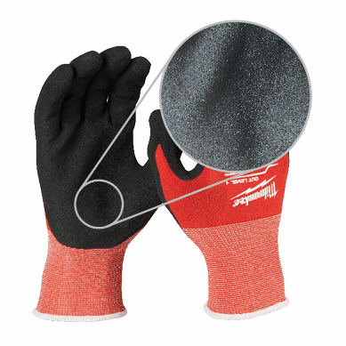 - Los guantes bañados en nitrilo anticorte nivel 1 de Milwaukee® cuentan con un revestimiento de nitrilo arenoso.