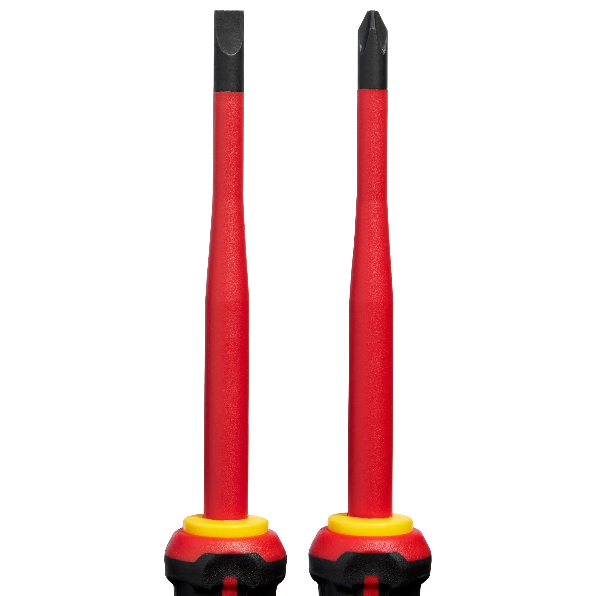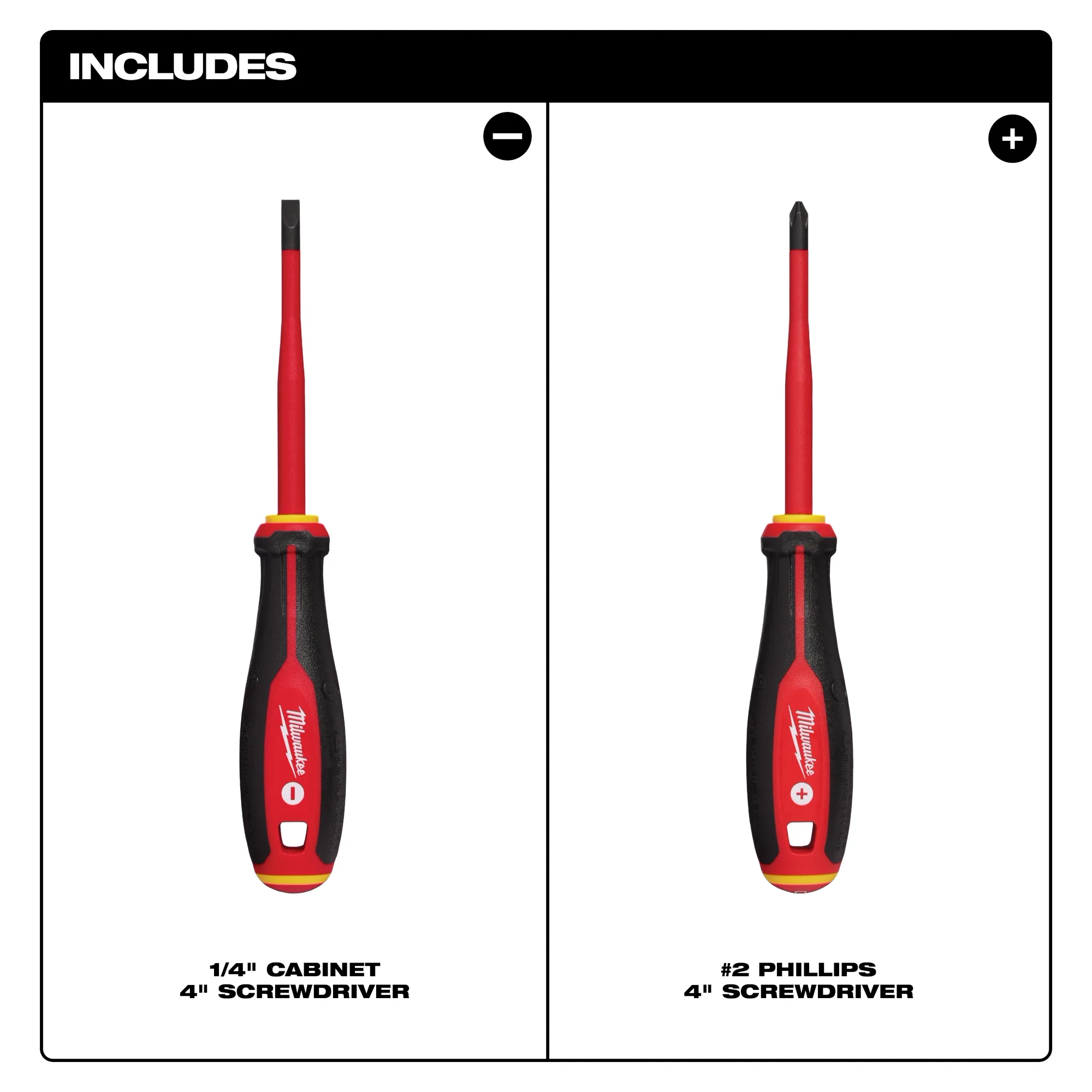 - Incluye destornilladores de punta delgada con aislamiento en los tamaños: Para gabinete de 1/4" x 4", Phillips n.º 2 x 4"