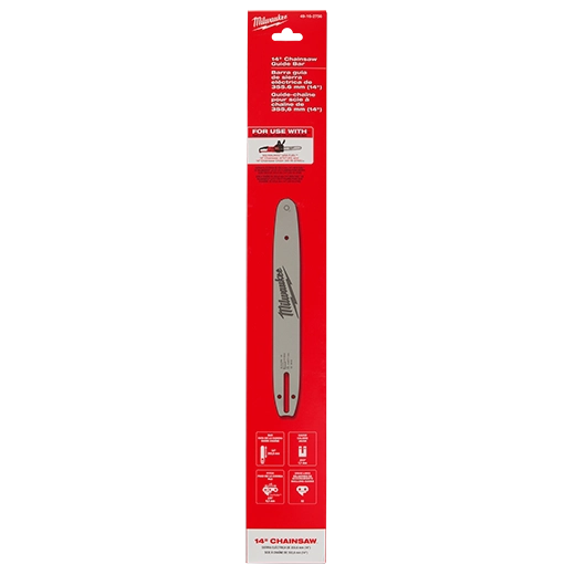 Nuestra barra guía de motosierra de 14" de MILWAUKEE® se usa con la motosierra M18 FUEL™ de 14" de MILWAUKEE® (2727-20C) y la barra guía de motosierra de 14" (48-09-5001). La barra tiene 14" de longitud, la inclinación es de perfil bajo de 3/8" y el calibre es de 0.043". El diseño de calado estrecho entrega la máxima eficiencia para un mayor tiempo de operación. La barra guía de la cadena de la sierra tiene un diseño duradero y es resistente al clima para una mayor vida útil.