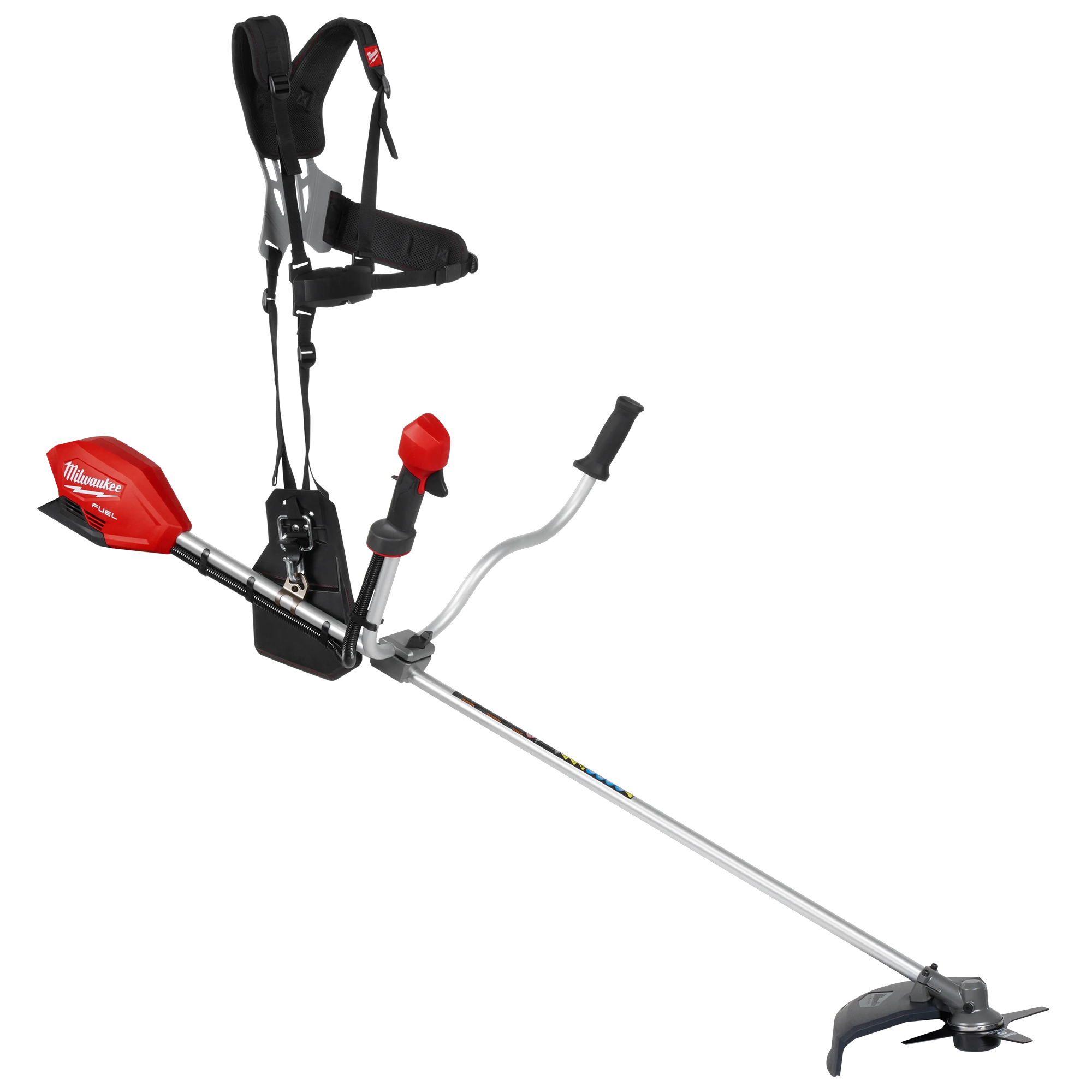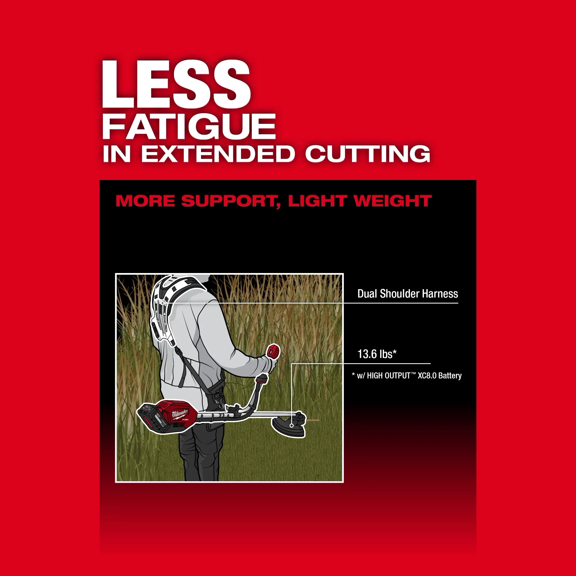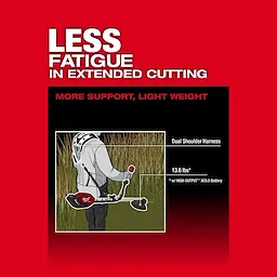 - El arnés con correa doble para el hombro distribuye el peso a través de ambos hombros, lo que reduce la fatiga durante aplicaciones de corte prolongadas.