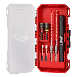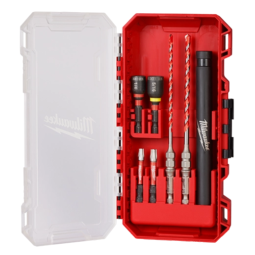 El kit incluye: (1) broca de carburo para taladro percutor de 5/32" x 4" x 6" con cabeza hexagonal, (1) broca de carburo para taladro percutor de 3/16" x 4" x 6" con cabeza hexagonal, (1) llave para tuercas para tornillos para hormigón de 1/4" SHOCKWAVE Impact Duty™, (1) llave para tuercas para tornillos para hormigón SHOCKWAVE Impact Duty™ de 5/16", (1) broca TORX® T25 SHOCKWAVE Impact Duty™ de 2", (1) broca TORX® T30 SHOCKWAVE Impact Duty™ de 2", (1) manguito de atornillado