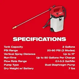• Cuando se combina con la batería M12™ REDLITHIUM™ CP2.0 incluida, el pulverizador entrega hasta 80 galones por carga