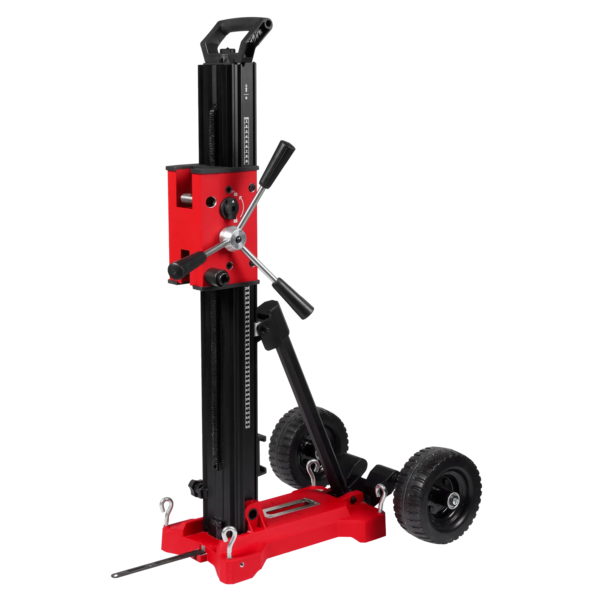 Nuestro soporte para perforador de núcleo para usar con el perforador de núcleo MX FUEL™ permite una instalación más rápida y la perforación de núcleos más versátil. El soporte para perforación de núcleos incluye (4) pernos de nivelación en cada esquina, además de (2) niveles de burbuja incrustados en la base y el mástil, lo que asegura que los usuarios estén nivelados y perforen núcleos con precisión en cualquier superficie. El indicador de centro del orificio integrado se puede alinear con el centro de los núcleos indicados en el lugar, mientras que la medición de distancia del soporte para perforador de núcleo al costado de la ranura de anclaje permite que el usuario siempre coloque el anclaje en el lugar correcto. El asa cuadrada del soporte para perforador de núcleo de ½” se puede usar para subir y bajar el sacabocados desde cualquier lado, inclinar el mástil en hasta 30 grados, y también sacar el sacabocados del mismo soporte. Las ruedas del soporte para perforador de núcleo son completamente desmontables, lo que permite que los usuarios reduzcan el peso y el espacio total cuando monten el soporte en una pared o entren en espacios estrechos.