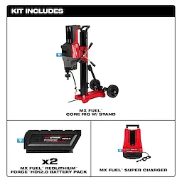 Incluye: (1) perforador de núcleo MX FUEL™ con soporte, (2) baterías MX FUEL™ REDLITHIUM™ 12.0, (1) supercargador MX FUEL™, (1) soporte para perforador de núcleo