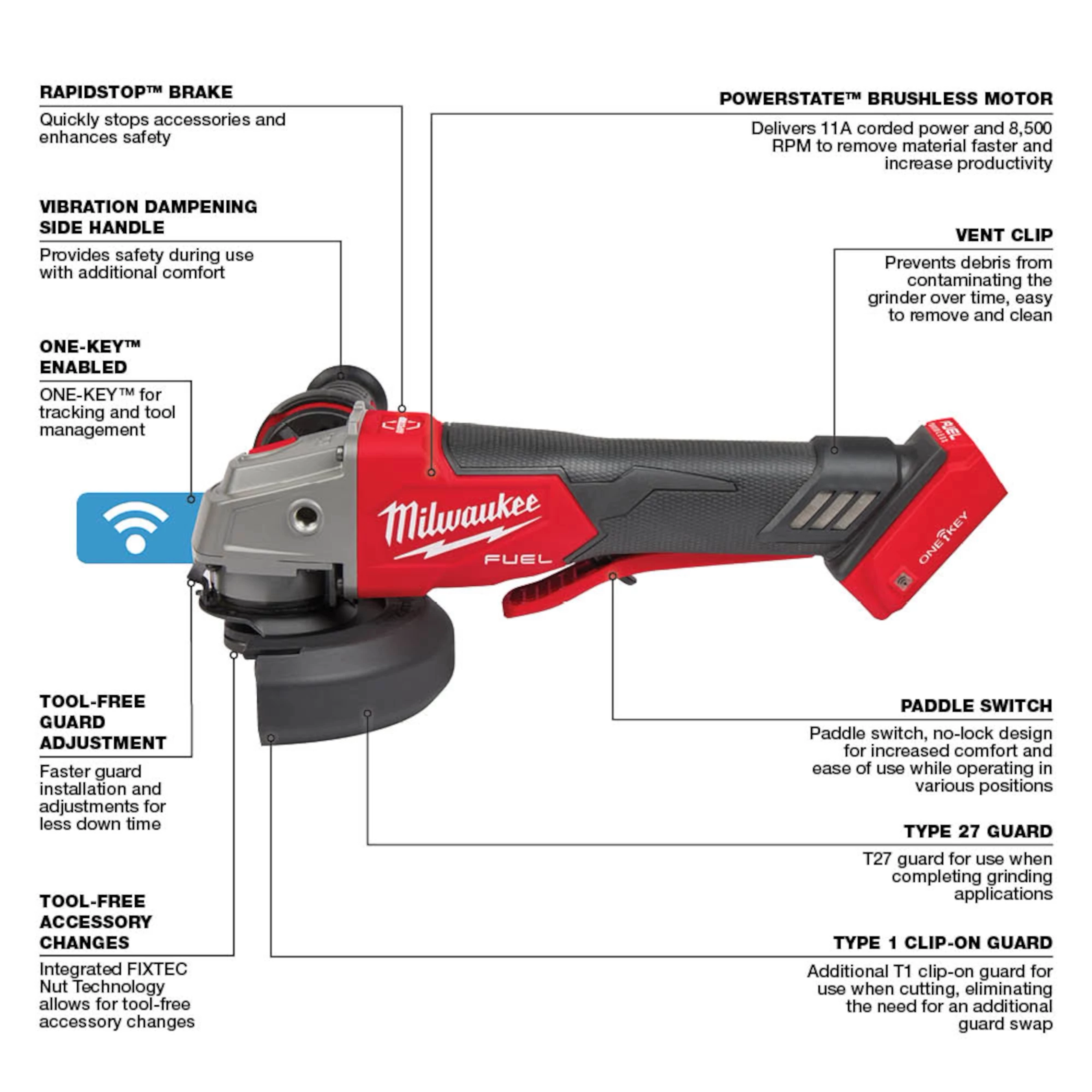 Our M18 FUEL™ 4-1/2" / 5" Braking Grinder with ONE-KEY™ Paddle Switch, No Lock is the next advancement in power and performance of cordless grinders while enhancing safety with its RAPIDSTOP™ Brake. The M18 FUEL™ 4-1/2" / 5" Braking Grinder with ONE-KEY™ generates 11A corded power to complete the toughest grinding and cutting applications. The POWERSTATE™ Brushless Motor delivers maximum sustained power and 8,500 RPM to remove material faster and increase productivity. REDLINK PLUS™ Intelligence ensures unmatched levels of performance, protection, and compatibility. The RAPIDSTOP™ Brake stops all accessories in 2 seconds or less. Our M18 FUEL™ 4-1/2" / 5" Braking Grinder with ONE-KEY™ includes an electronic clutch for kickback protection, as well as overload protection to maximize motor life. Compatible with ONE-KEY™, this grinder wirelessly connects to a smartphone to track and manage the tool, providing you with visibility to where tools are across your network of jobs. The M18™ REDLITHIUM™ HIGH OUTPUT™ XC6.0 Batteries (not included) deliver 50% more power while running 50% cooler than the M18™ REDLITHIUM™ XC Batteries. Experience faster accessory changes, and less downtime with tool-free accessory and guard adjustments, while remaining fully compatible with the most common accessories in the market. The MILWAUKEE® M18 FUEL™ 4-1/2" / 5" Braking Grinder with ONE-KEY™ is the next level of jobsite productivity and enhanced safety in cordless grinders.